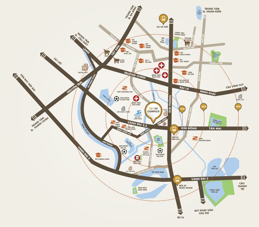 • Dự án T&T DC Complex tọa lạc tại số 120 Định Công, phường Định Công, quận Hoàng Mai, Hà Nội. Vị trí tiếp giáp giữa 3 quận nội đô. Nằm trên đường vành đai 2,5 tuyến đường huyết mạnh của Thành phố, cách đường Quốc lộ 1A (đường Giải Phóng) 300m. Cư dân sống trong chung cư T&T DC Complex có thể dễ dàng tiếp cận được mọi tiện ích của khu vực.