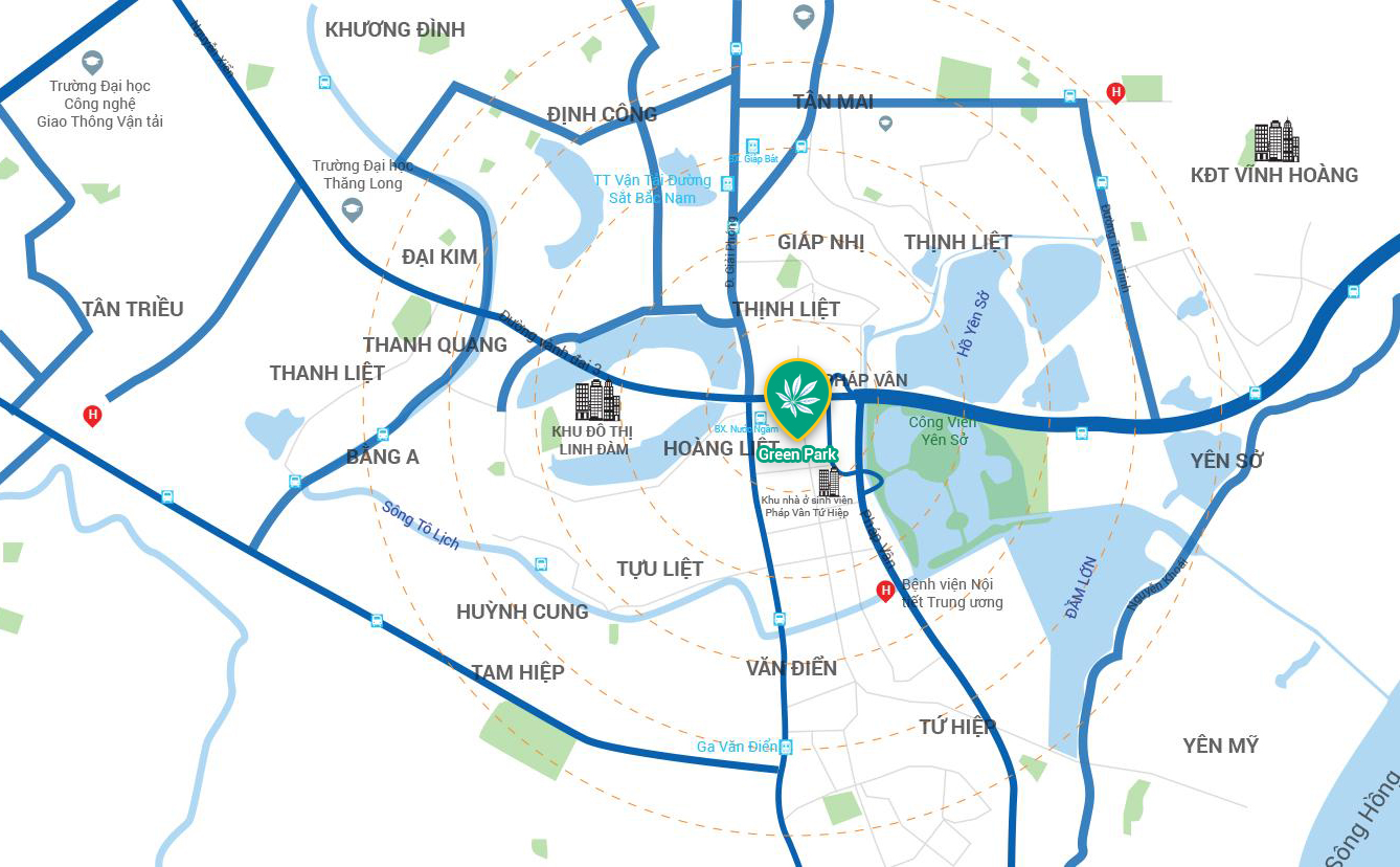 • Từ Dự án PD Green Park quận Hoàng Mai cư dân mất chưa tới 2 phút để tiếp cận toàn bộ hệ thống giao thông Ngọc Hồi, Pháp Vân Cầu Giẽ, Giải Phóng, đường Vành Đai 3 cũng như tiện ích đồng bộ tại KĐT Pháp Vân – Tứ Hiệp. Xa hơn một chút là quần thể Tiện ích khu vực hiện đại như Công Viên Yên Sở, hồ điều hòa KĐT Linh Đàm.