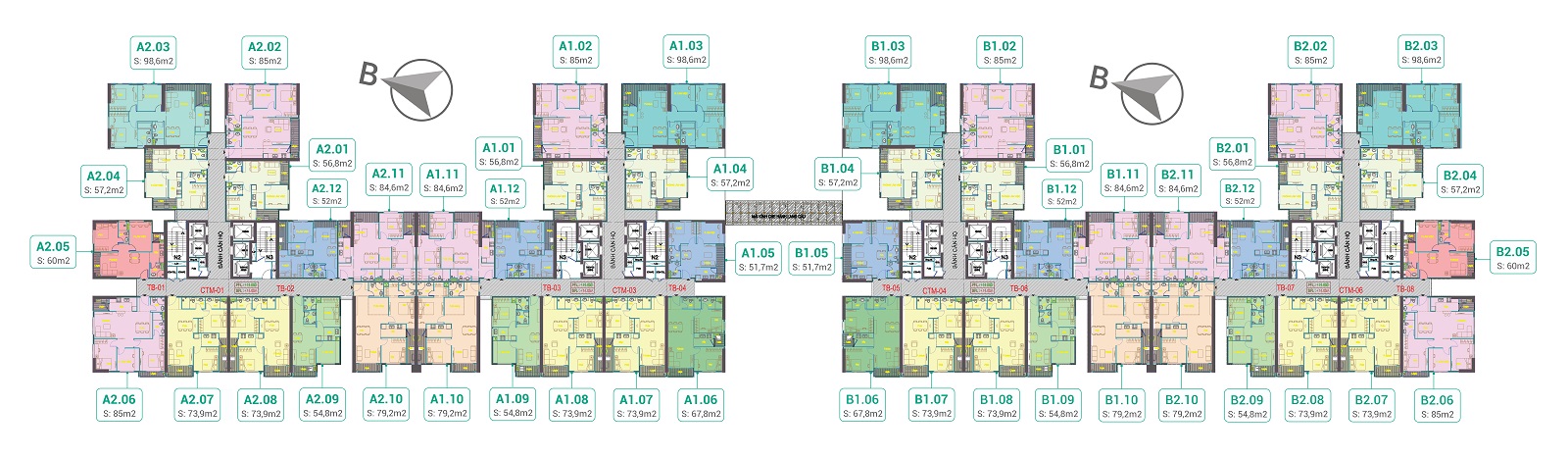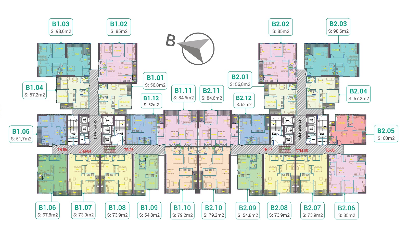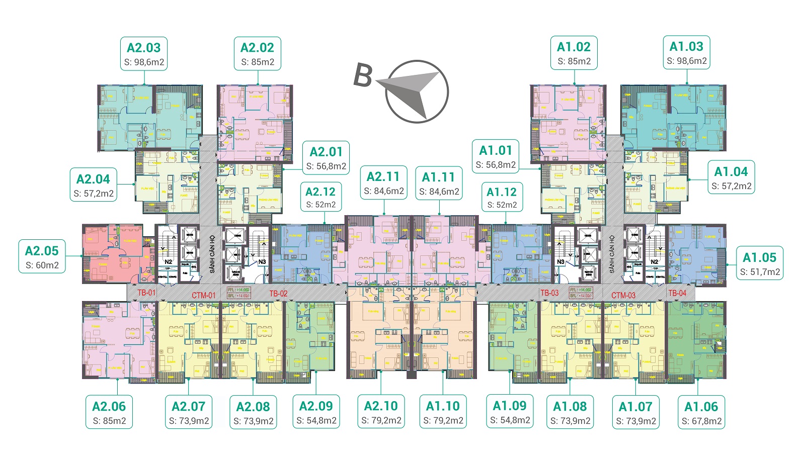 • Số căn/tầng: 12 căn hộ/1 sàn, 5 thang máy, 2 thang thoát hiểm