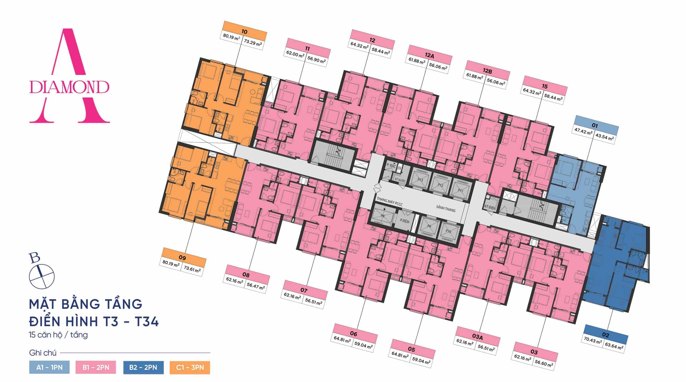 - Diamond Tower B: 483 căn (15 căn / sàn) (465 căn hộ cc + 18 căn Pen)