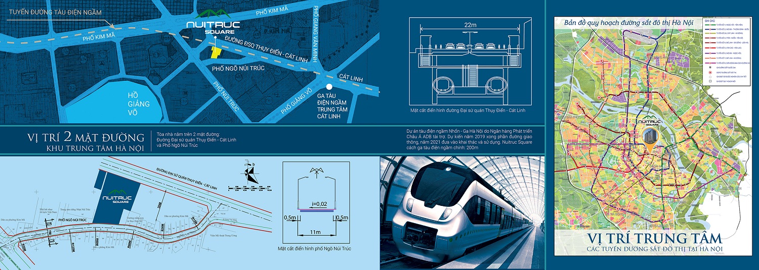 • Theo quy hoạch của thành phố Hà Nội thì Tòa nhà sẽ nằm trên mặt đường chính rộng 22m, phía dưới là tuyến tàu điện ngầm của thành phố.cách ga tàu điện trên cao cát linh 200m. Các vị trí tiếp giáp Dự án Núi Trúc Square: