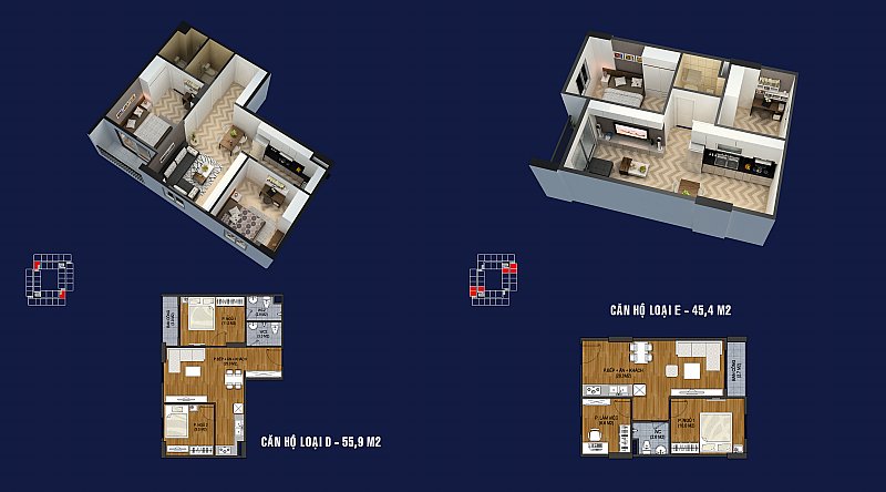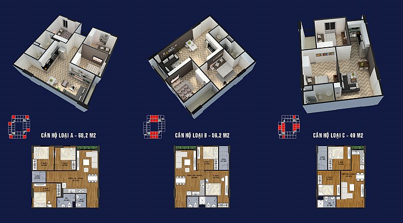 • Diện tích: 45.4m2 - 49m2 – 55.9m2 – 56.2m2 – 68.2m2