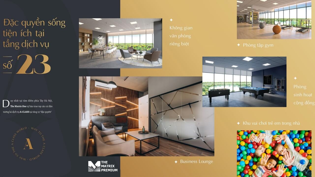• Cùng với những tiện ích bên ngoài dự án, không gian của The Matrix Premium còn có các siêu thị mini, bể bơi bốn mùa, phòng tập Gym, hệ thống máy tập ngoài trời, sân tennis, sân bóng rổ, bóng đá... Chính vì thế, The Matrix Matrix Mễ Trì nổi lên với những điểm sáng ấn tượng và đang trở thành sự lựa chọn của tầng lớp thượng lưu tại Hà Nội.