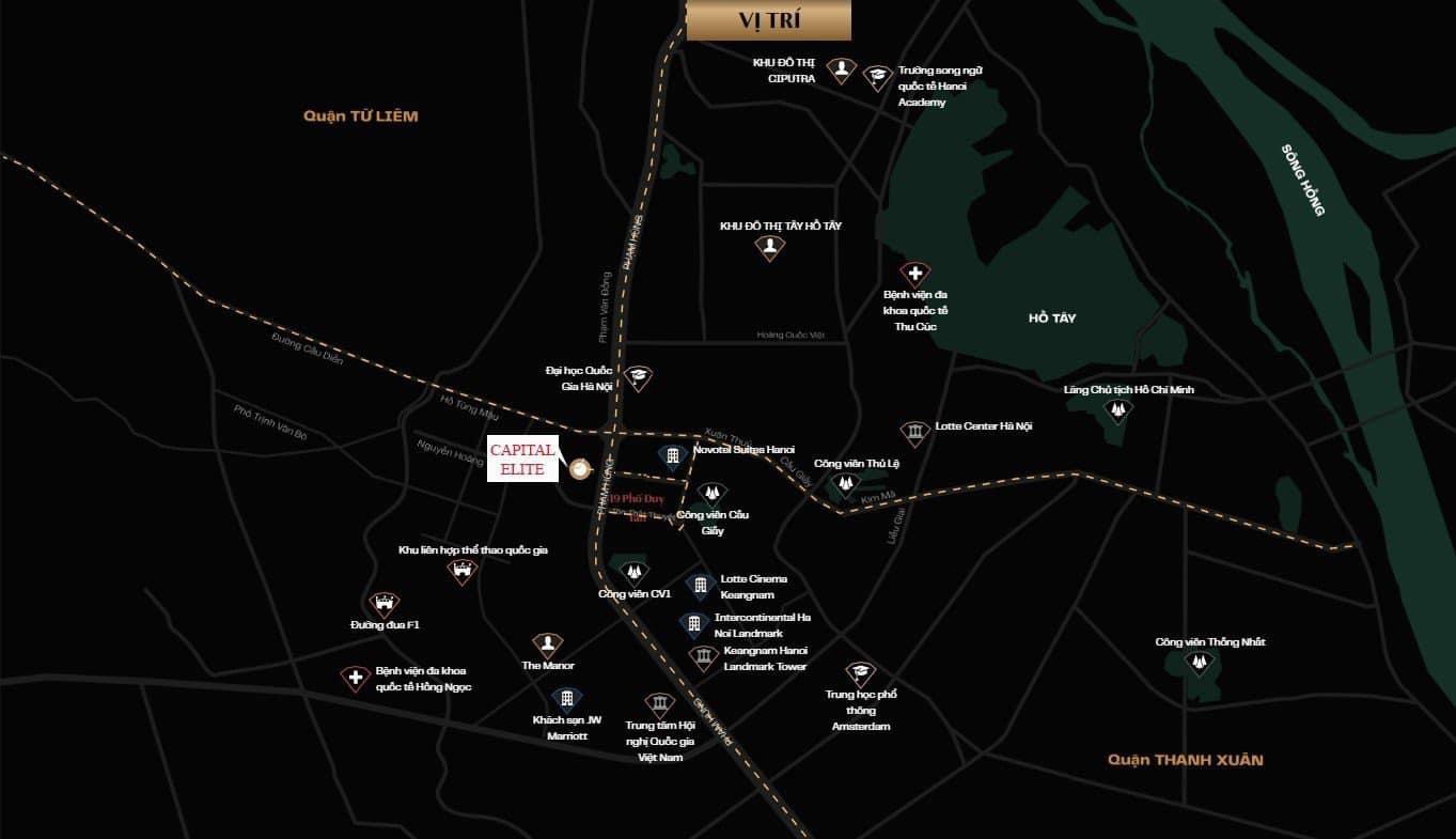 • Dự án Capital Elite tọa lạc tại số 18 đường Phạm Hùng, phường Mỹ Đình 2, quận Nam Từ Liêm, Hà Nội. Đây là vị trí trung tâm quận Nam Từ Liêm, dễ dàng kết nối với các khu vực lân cận và các trung tâm thương mại, giáo dục, y tế, văn hóa, giải trí lớn như IPH, The Garden, Big C Thăng Long, Keangnam, Lotte Center Hanoi, Bệnh viện E, KĐT Ciputra, sân bay Nội Bài, …