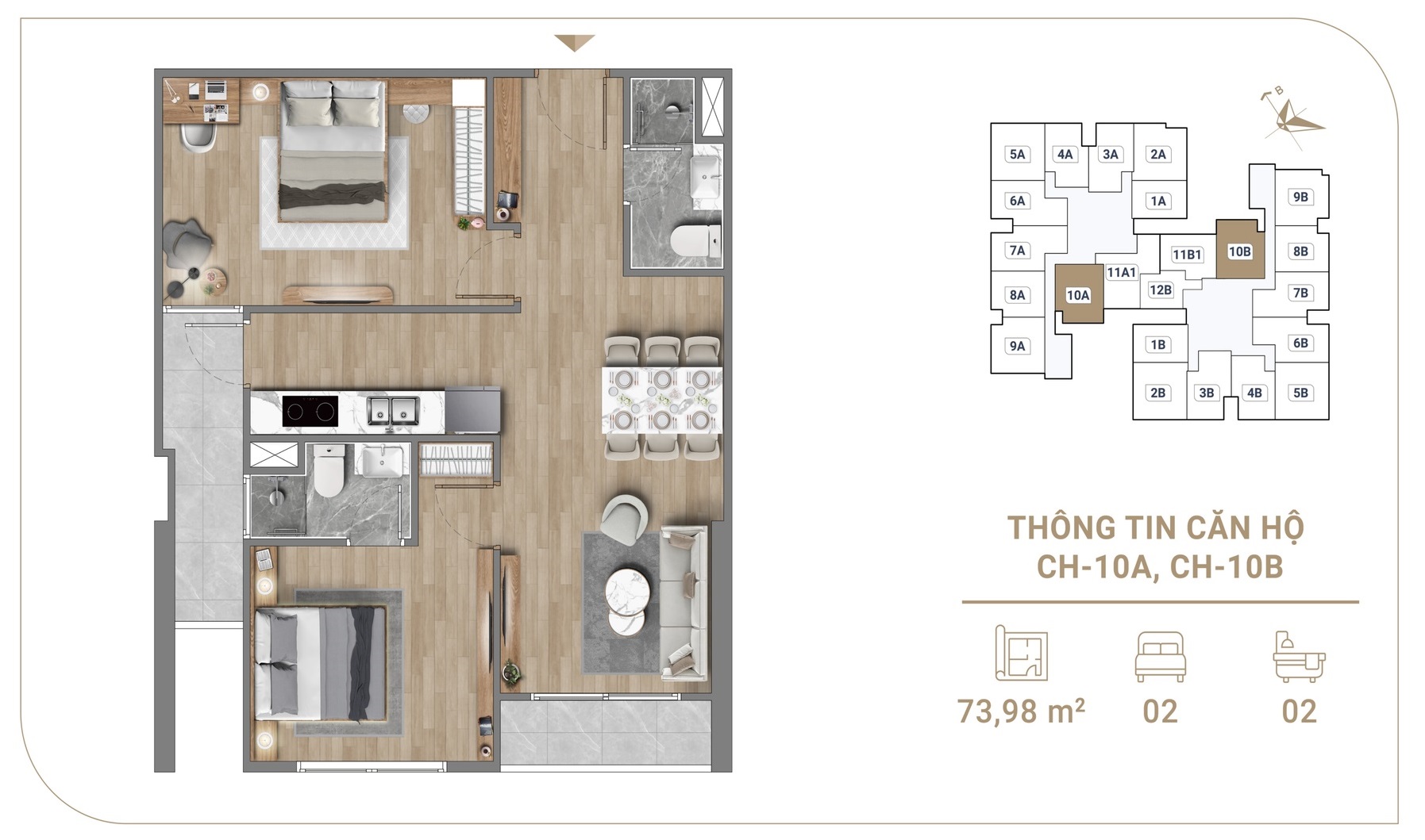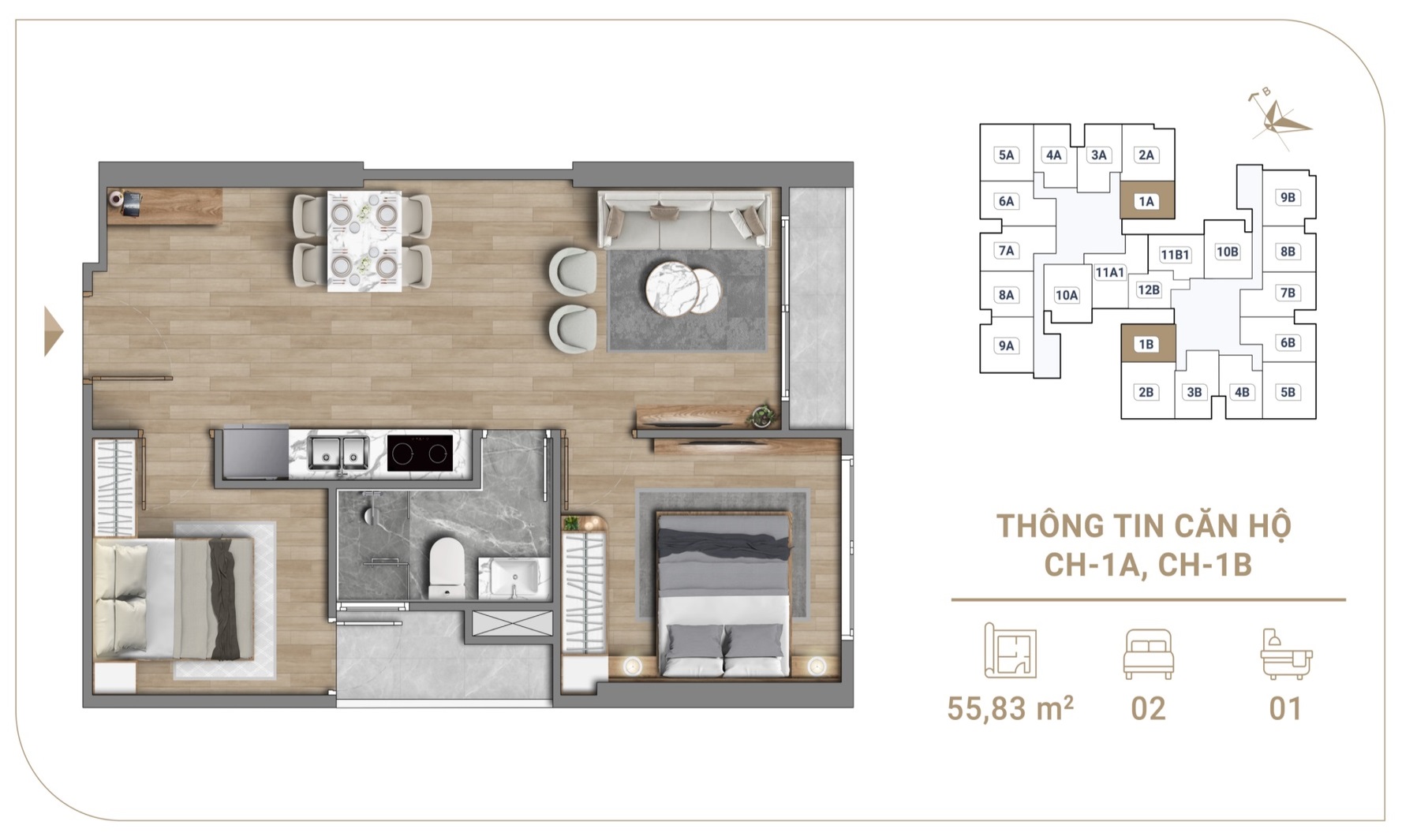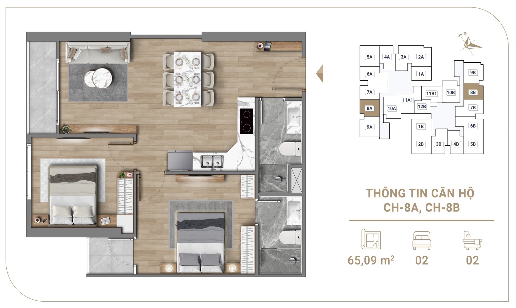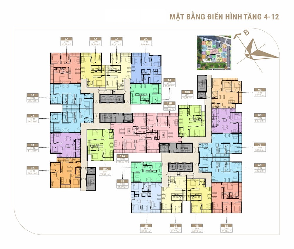 • Diện tích căn hộ: 56-65-67-76-77-79-80-98 m2