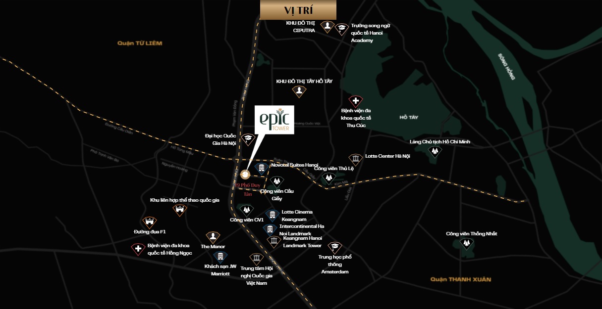• Epic Tower tọa lạc tại số 19 Duy Tân, Q. Cầu Giấy, Hà Nội - một vị trí đắc địa, độc đáo nhất khu vực Cầu Giấy. Phía Bắc giáp phố Duy Tân, phía Tây giáp khu đất của Ngân hàng BIDV, phía Đông giáp khu đất của Công ty Ford Thăng Long, phía Nam Khu đất Công ty Bưu chính viễn thông liên tỉnh và Khu đất Công ty cổ phần thiết bị y tế Medinsco