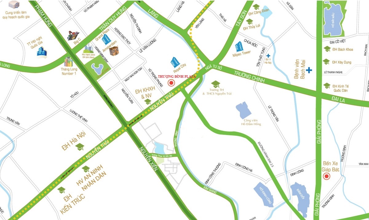 • Với vị trí trung tâm, Thượng Đình Plaza còn có ưu điểm nổi trội về giao thông thuận tiện. Tiếp giáp hiện hữu với đường Nguyễn Trãi và Chính Kinh giúp di chuyển thuận lợi về các hướng. Tương lai gần sẽ là đường vành đai 2,5 mở bên cạnh dự án cộng với điểm nhà ga tàu điện trên không sẽ cộng hưởng thêm ưu điểm của tòa nhà.